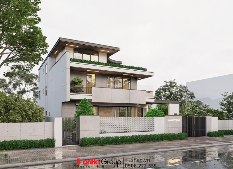 Mặt tiền căn biệt thự hiện đại 3 tầng gây ấn tượng với lối thiết kế mở - nơi ánh sáng tự nhiên có thể xuyên qua mọi tầng lớp của không gian sống, đồng thời kết nối trực quan giữa nội và ngoại thất. Hệ lam che nắng, ban công thoáng và các mảng tường xanh phủ đầy dây leo tạo nên “lớp áo” vừa sang trọng, vừa gần gũi với thiên nhiên.