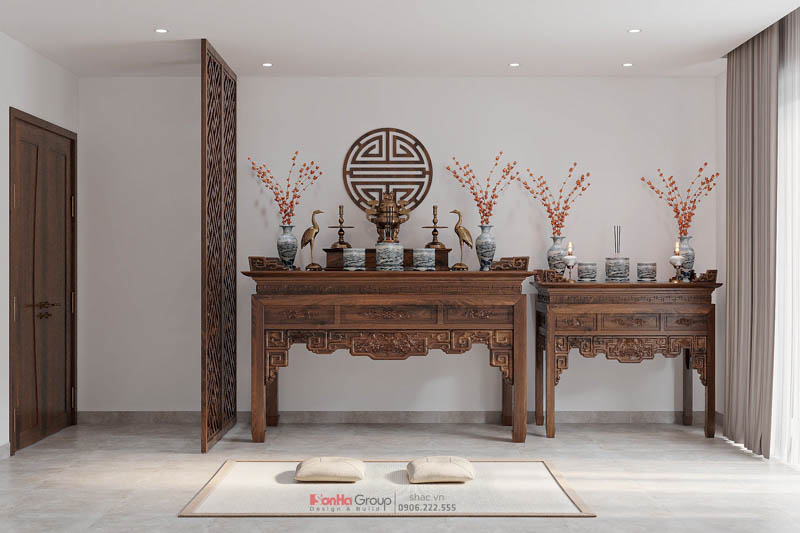 Mẫu thiết kế phòng thờ có bàn thờ được bố trí cân đối, hoa văn chạm khắc công phu, đi kèm những vật phẩm phong thủy như hạc đồng, lư hương, đèn dầu và bình hoa trang trí. Phía sau, vách ngăn gỗ với họa tiết cổ điển tạo sự riêng tư mà vẫn duy trì sự thoáng đãng.