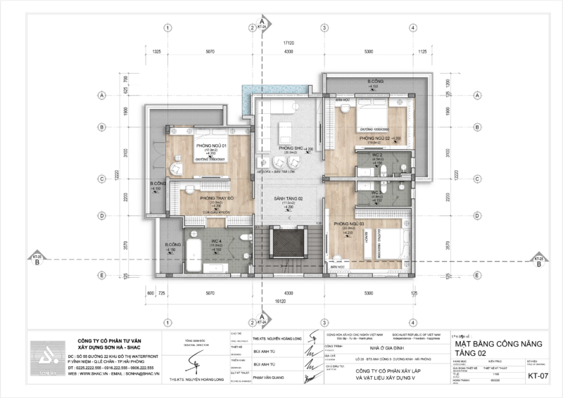 Tầng 2: 03 Phòng ngủ, 03 wc, Phòng thay đồ, Phòng sinh hoạt chung, Sảnh tầng, Ban công