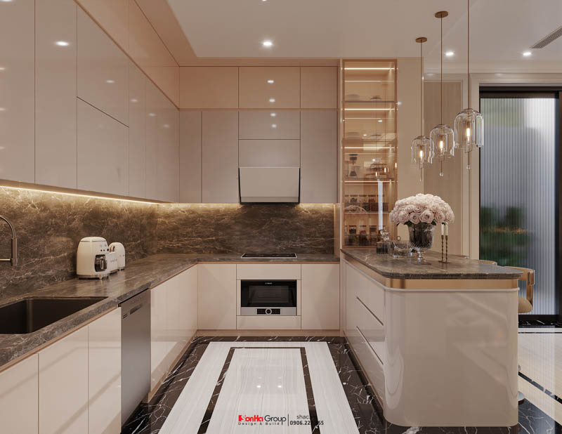 Không gian bếp ăn là một bản giao hưởng của sự tinh tế và sang trọng, kết hợp hài hòa giữa chất liệu cao cấp và thiết kế hiện đại. Đảo bếp đá cẩm thạch với hệ đèn LED xuyên sáng tạo điểm nhấn huyền ảo, trong khi hệ tủ gỗ óc chó kết hợp sơn trắng nhã nhặn mang lại vẻ đẹp trang nhã và thanh lịch.
