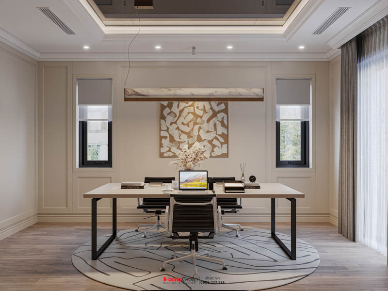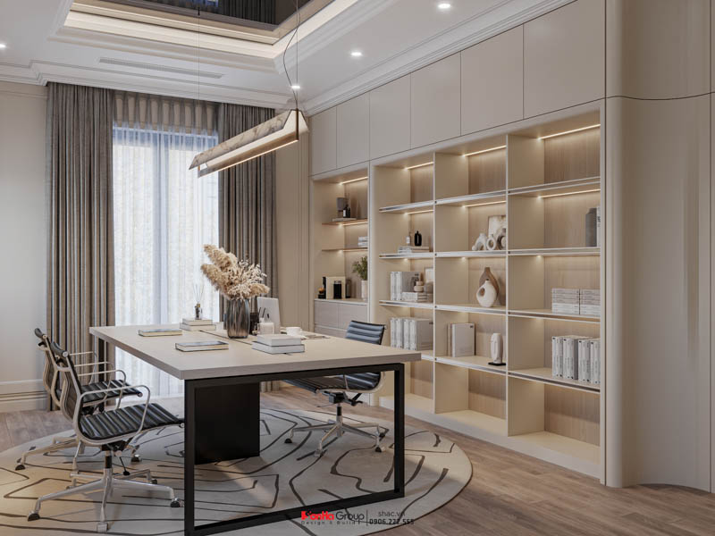 Phòng làm việc được bố trí tại tầng 2 của biệt thự mang phong cách tân cổ điển hiện đại, là sự kết hợp hoàn hảo giữa tính thẩm mỹ tinh tế và công năng tối ưu. Không gian được thiết kế với bảng màu trung tính sang trọng như be, trắng ngà và nâu gỗ, tạo nên bầu không khí tập trung, chuyên nghiệp nhưng vẫn thư thái.