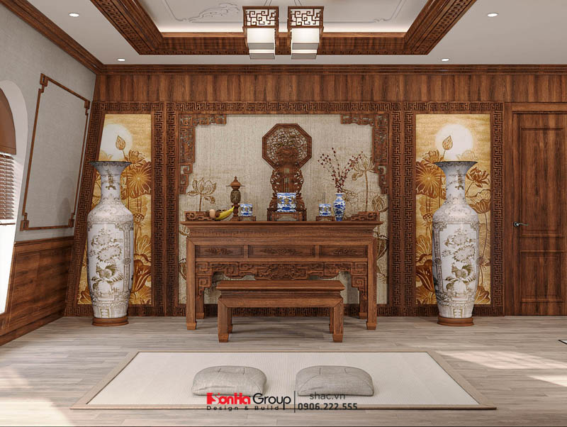 Nội thất phòng thờ chủ yếu sử dụng chất liệu gỗ tự nhiên với các đường nét chạm khắc tinh xảo, thể hiện sự tôn kính và truyền thống. Bàn thờ chính được bố trí ở trung tâm, kết hợp cùng hệ tủ phụ và hoành phi câu đối tạo nên tổng thể hài hòa, chuẩn phong thủy.