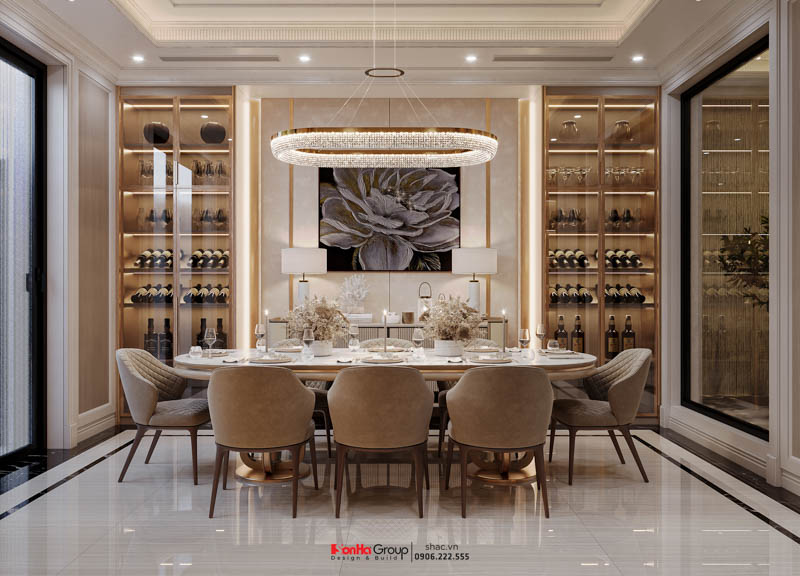 Đèn thả thủy tinh dáng trụ lấp lánh tựa những viên pha lê, soi rọi từng đường nét hoàn mỹ. Bộ bàn ăn bọc nhung mềm mại, chân mạ vàng sang trọng, kết hợp cùng kệ rượu kính viền kim loại ánh kim, tạo nên một tổng thể lộng lẫy, đẳng cấp và đầy tính nghệ thuật.