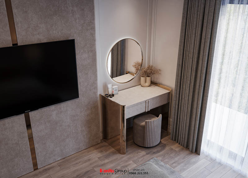 Thiết kế phòng ngủ con trai tại tầng 3 biệt thự tân cổ điển tại Hải Phòng mang đến một không gian sống hiện đại, tinh tế với tông màu trung tính chủ đạo như be, trắng kem và nâu nhạt. Căn phòng gây ấn tượng với thiết kế ánh sáng âm trần và đèn hắt đầu giường tạo nên điểm nhấn trang nhã, ấm áp. Giường ngủ lớn được đặt chính giữa, kết hợp cùng tủ đầu giường và trang trí nhẹ nhàng, mang lại cảm giác thư giãn tuyệt đối.