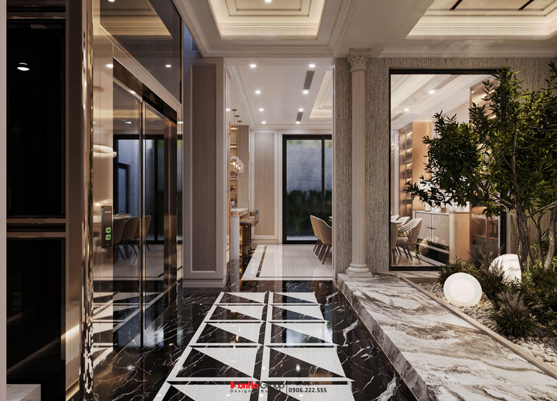 Khu vực sảnh chính là sự giao thoa hoàn mỹ giữa nét cổ điển sang trọng và hơi thở hiện đại, tạo nên một không gian đầy mê hoặc. Trần nhà được chạm khắc tinh tế, kết hợp cùng hệ thống đèn âm trần tỏa ánh sáng dịu nhẹ, làm nổi bật từng đường nét kiến trúc. Nền đá cẩm thạch với họa tiết hình học độc đáo hòa quyện cùng sắc vàng kim của thang máy, nâng tầm đẳng cấp cho không gian.