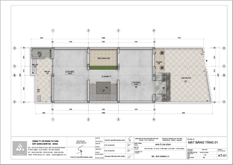 Tầng 1 được bố trí sân trước rộng rãi vừa để xe vừa là vườn cây, Phòng khách, Tiểu cảnh khô, Phòng bếp-ăn, Sảnh thang, Sân sau, WC
