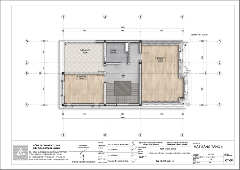 Tầng 4: Phòng thờ, Phòng ngủ giúp việc, Phòng kho, Giặt phơi