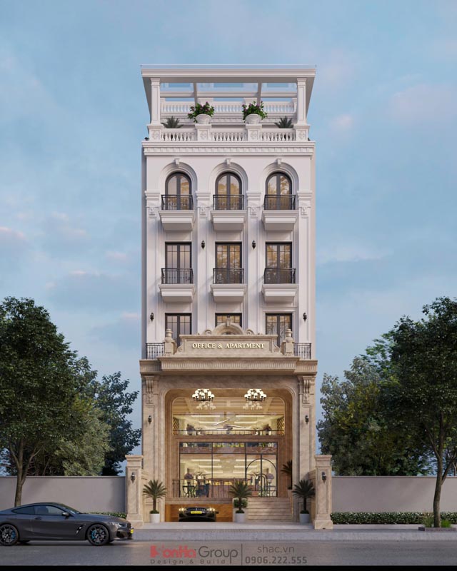 Ngay từ cái nhìn đầu tiên, tòa nhà ghi dấu ấn mạnh mẽ bởi những đường nét kiến trúc mềm mại nhưng dứt khoát, hệ cột trụ vững chãi, các mảng tường trang trí tinh xảo và ban công vòm cong quyến rũ. Gam màu trắng tinh tế phối cùng đá marble tự nhiên tại tầng trệt, tạo nên hiệu ứng thị giác sang trọng, quyền lực.