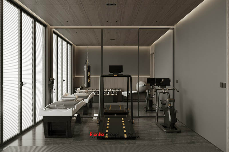 Phòng gym hiện đại, với đầy đủ thiết bị tập luyện giúp gia chủ có thể duy trì thói quen rèn luyện sức khỏe.