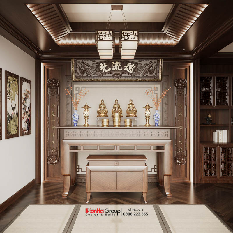 Phòng thờ trang nghiêm, thiết kế tinh tế, đảm bảo sự thanh tịnh và trang trọng.