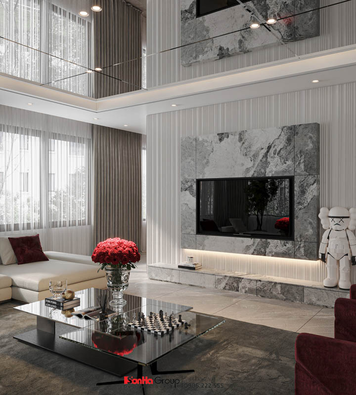 Phòng khách trên tầng 3 với thiết kế trần gương, giúp tăng chiều sâu và cao cho không gian