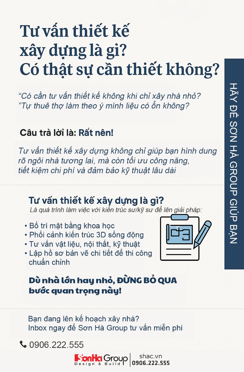 Tư vấn thiết kế xây dựng là bước quan trọng giúp bạn sở hữu ngôi nhà đẹp, tối ưu công năng, tiết kiệm chi phí và đảm bảo an toàn kỹ thuật. Cùng Sơn Hà Group khám phá 5 lợi ích không thể bỏ qua trong bài viết này!